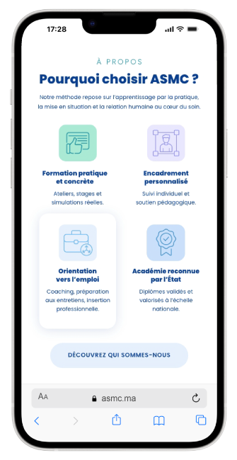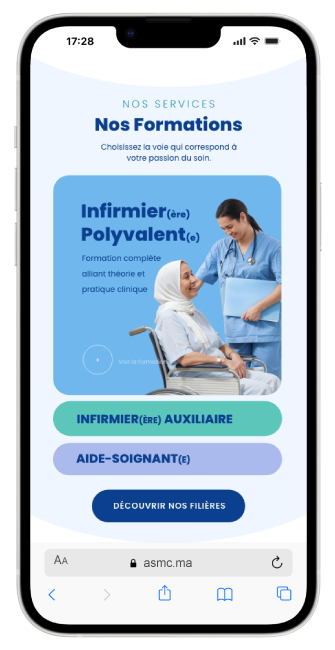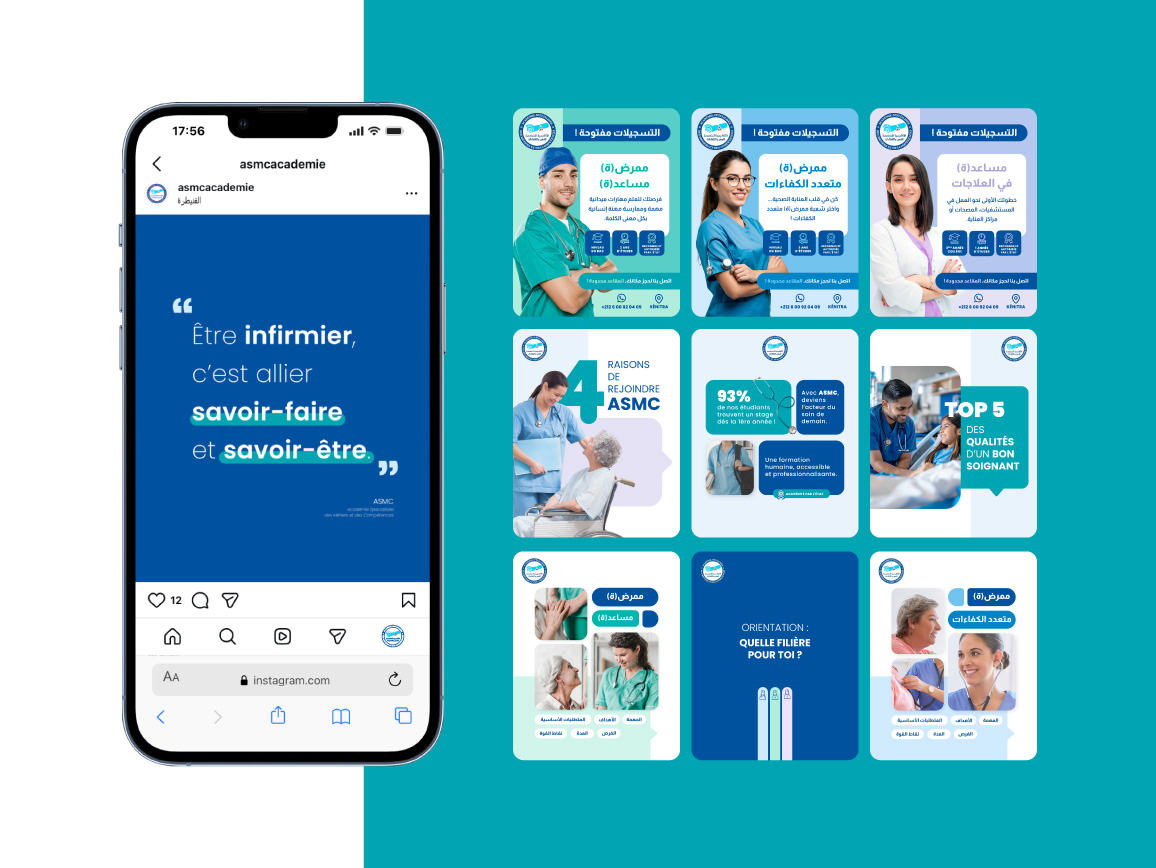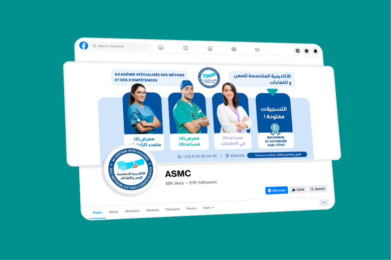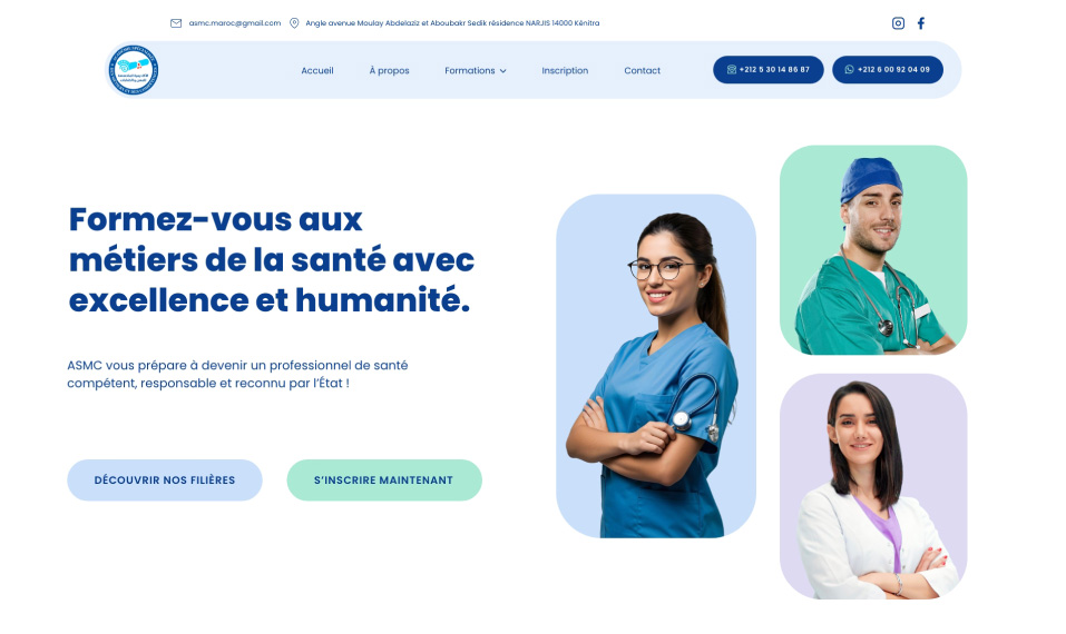 L’ASMC est un institut de formation paramédicale basé à Kénitra, spécialisé dans la formation aux métiers de la santé. L’académie avait besoin de construire une image moderne, professionnelle et rassurante afin de gagner en notoriété et d’attirer des étudiants motivés dans un secteur exigeant et humain.
