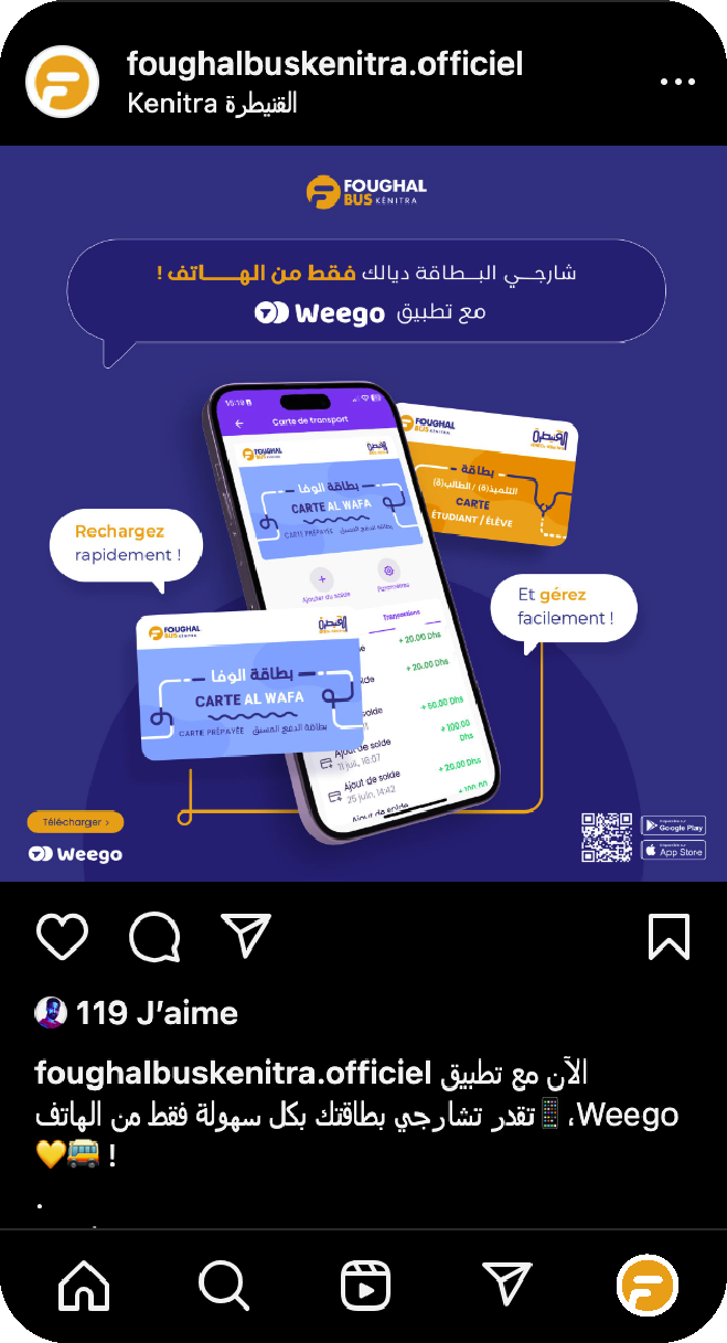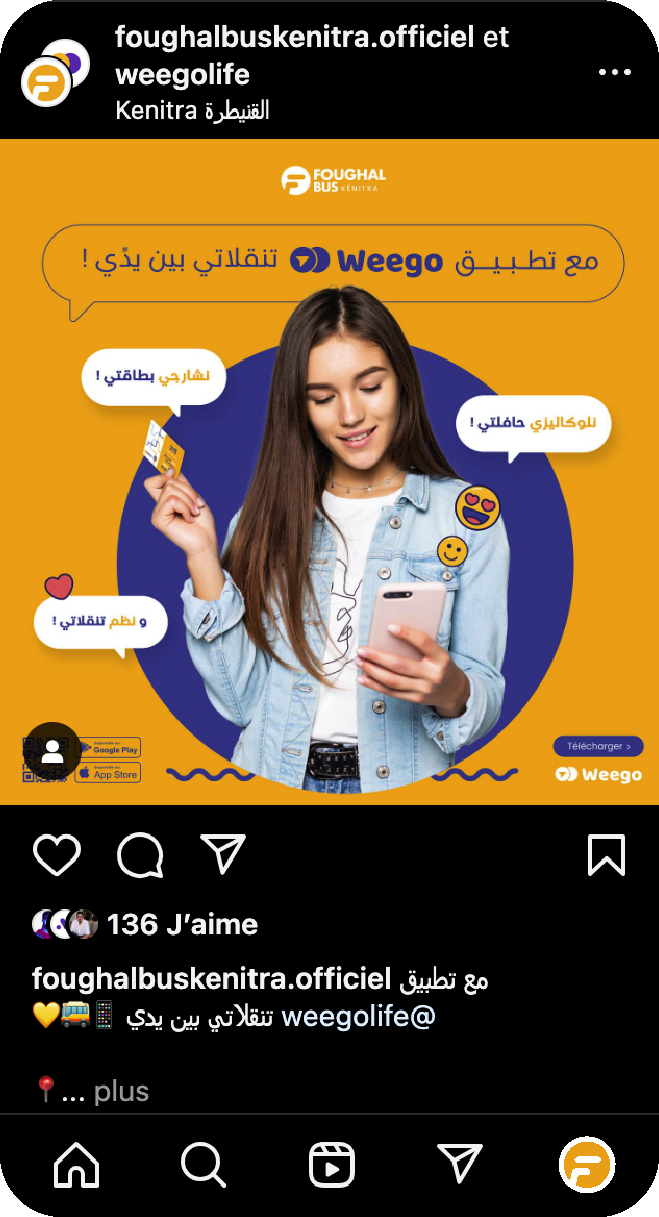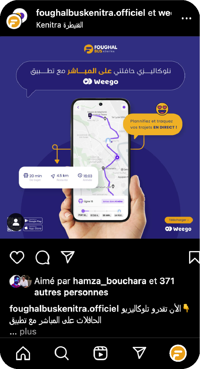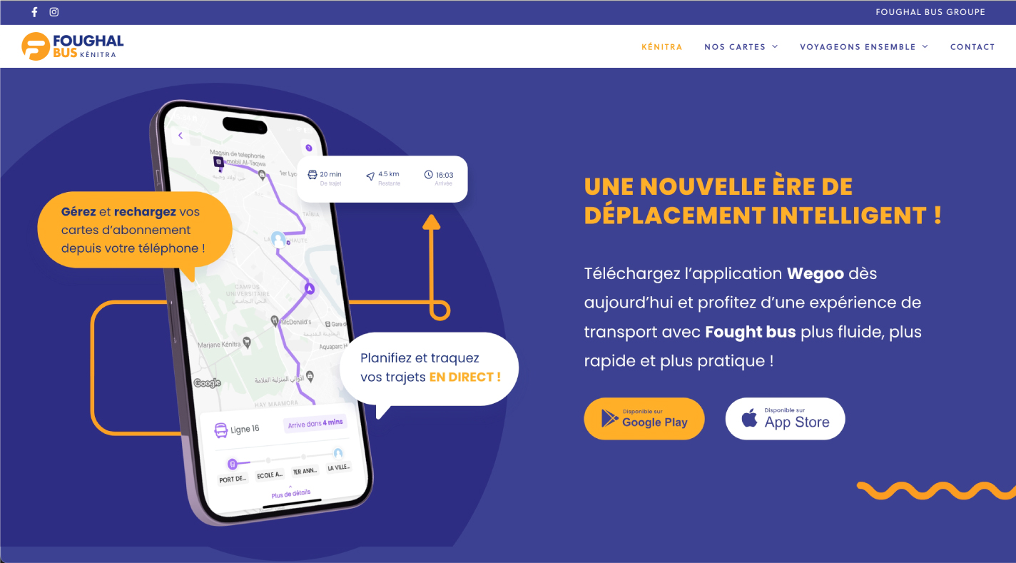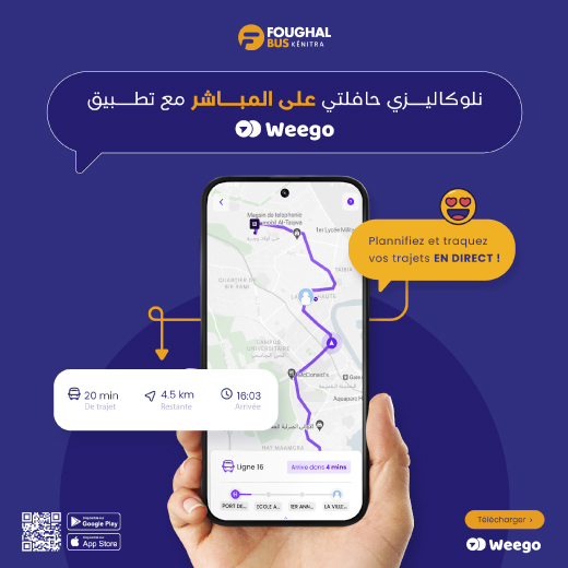 La collaboration entre Foughal Bus Kénitra et Weego offre aux usagers une application mobile complète, permettant de planifier leurs trajets, de suivre les bus en temps réel et d'acheter leurs billets directement depuis leur smartphone.