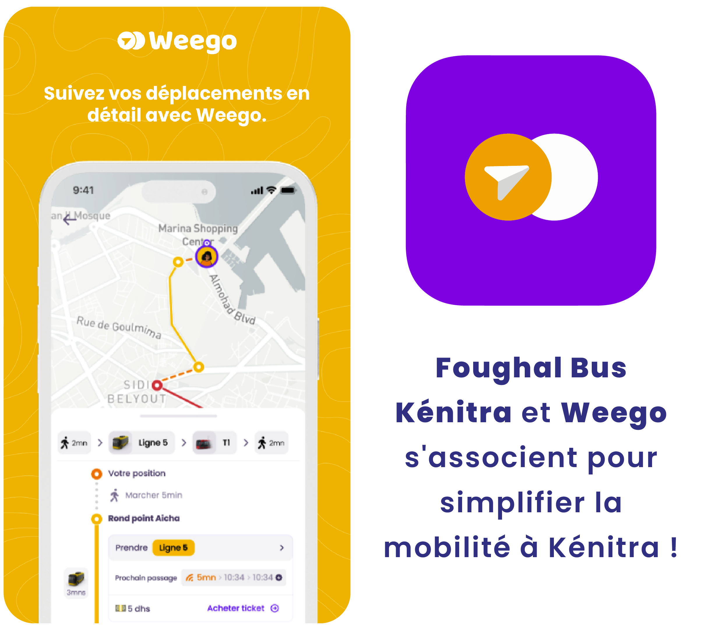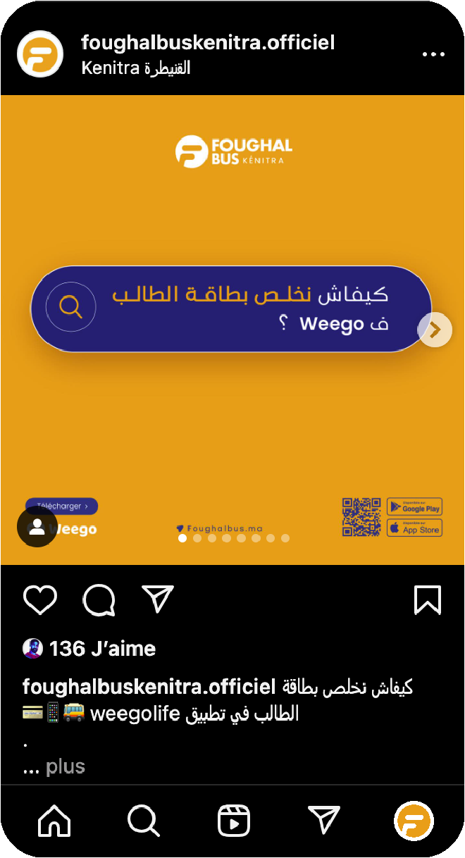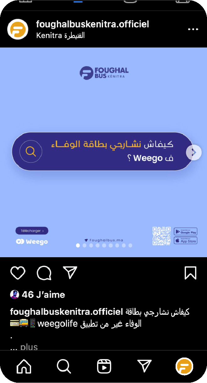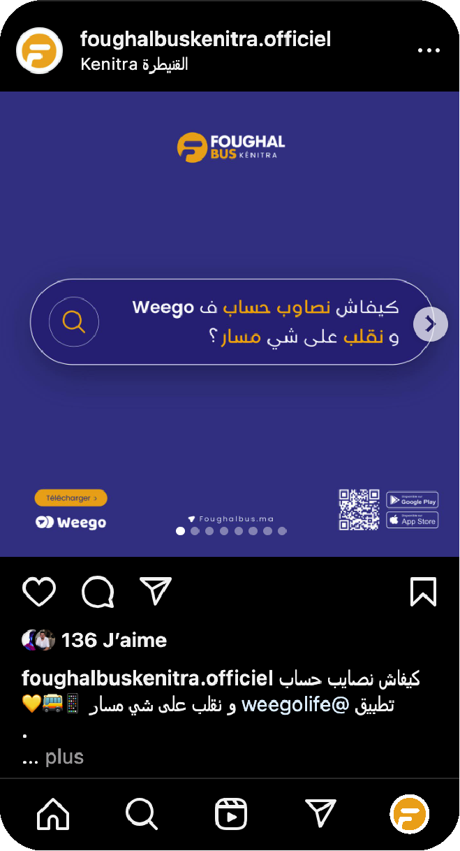 La collaboration entre Foughal Bus Kénitra et Weego offre aux usagers une application mobile complète, permettant de planifier leurs trajets, de suivre les bus en temps réel et d'acheter leurs billets directement depuis leur smartphone.
