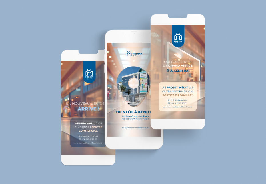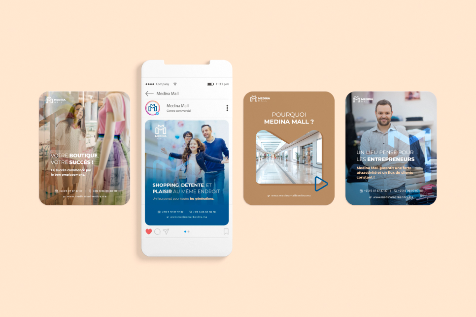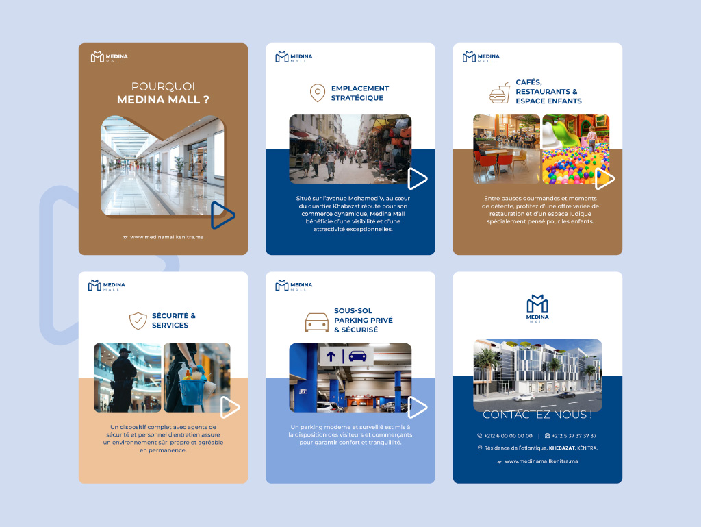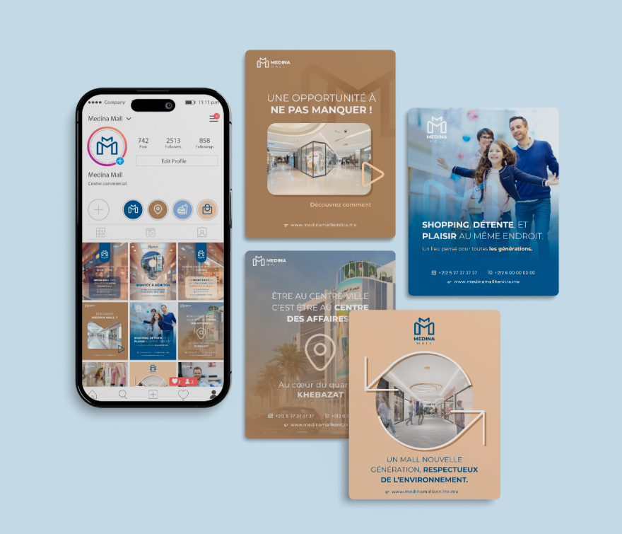L’identité visuelle de MEDINA MALL sur les réseaux sociaux repose sur une charte moderne, élégante et cohérente avec l’image du projet. Des tons sobres et contemporains, inspirant confiance et modernité. combinaison d’images lifestyle (familles, entrepreneurs, vie urbaine) et d’éléments graphiques harmonisés pour renforcer l’impact visuel. Afin de créer une communication variée et engageante, plusieurs axes éditoriaux sont développés.