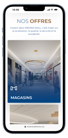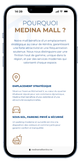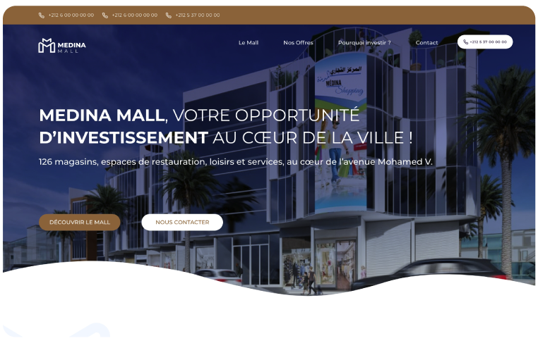 Le site web de MEDINA MALL s’organise autour d’une navigation simple et efficace : une page dédiée au Mall et à sa vision, une section complète sur les offres (magasins, restauration, loisirs, services), un espace investisseurs clair et stratégique, ainsi qu’une page contact accessible en un clic. Un parcours fluide, pensé pour informer, orienter et accompagner chaque utilisateur.