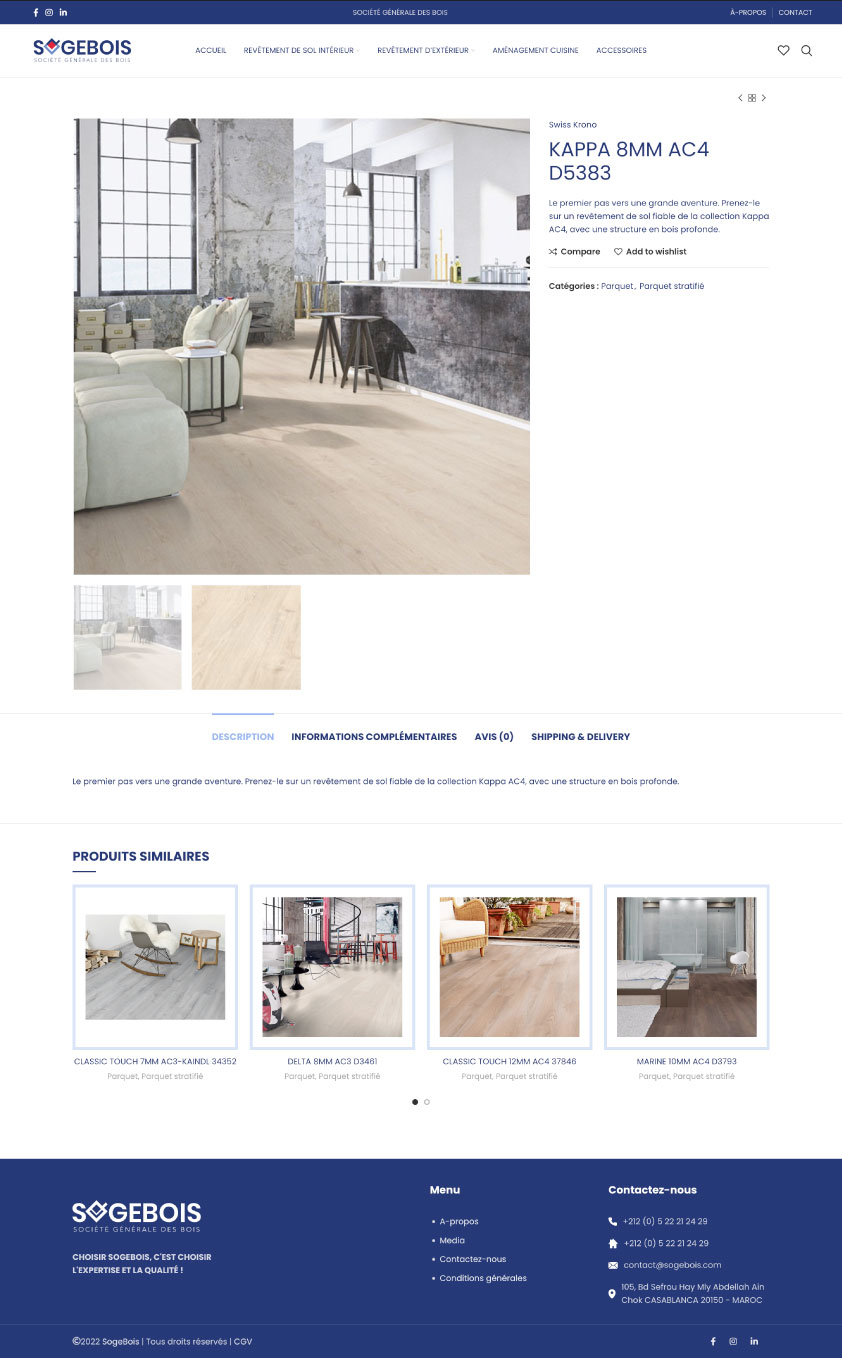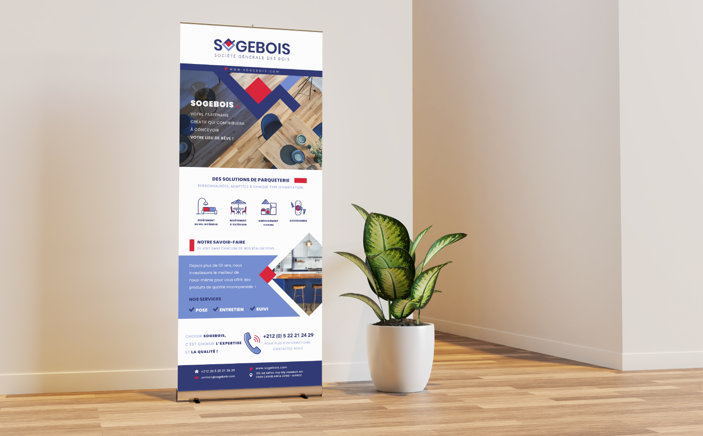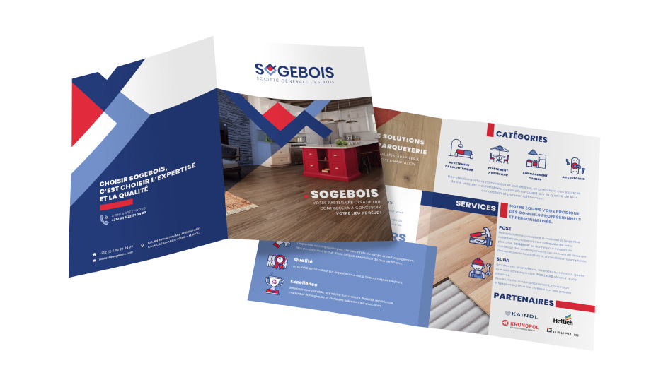 SOGÉ BOIS, entreprise marocaine spécialisée dans la distribution et la commercialisation de parquet et de cuisines équipées, possède un savoir-faire transmis de génération en génération. Afin d'asseoir sa notoriété et de moderniser son image, l'entreprise a souhaité développer une identité visuelle forte et des supports de communication professionnels alignés sur ses valeurs de qualité, d'expertise et de satisfaction client.